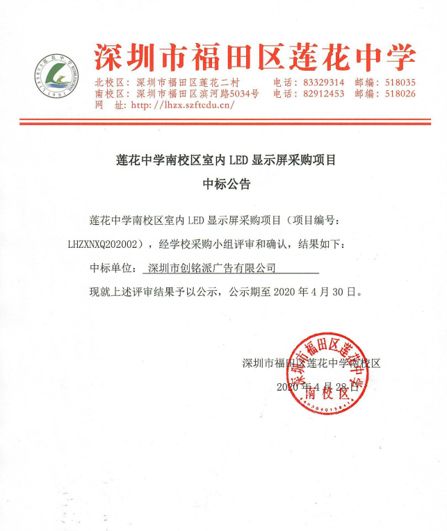 必威be南校区室内LED显示屏采购项目中标公告