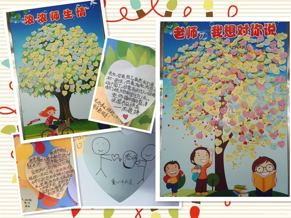 学校门口的一个巨大展板上写着“老师,我想对您说”,上面贴着五颜六色的卡片,这些都是学生们最想对老师说的话。小小的卡片上不仅写满了祝福的话,还画满了孩子和老师的日常生活,处处流露着孩子们的幸福和快乐!