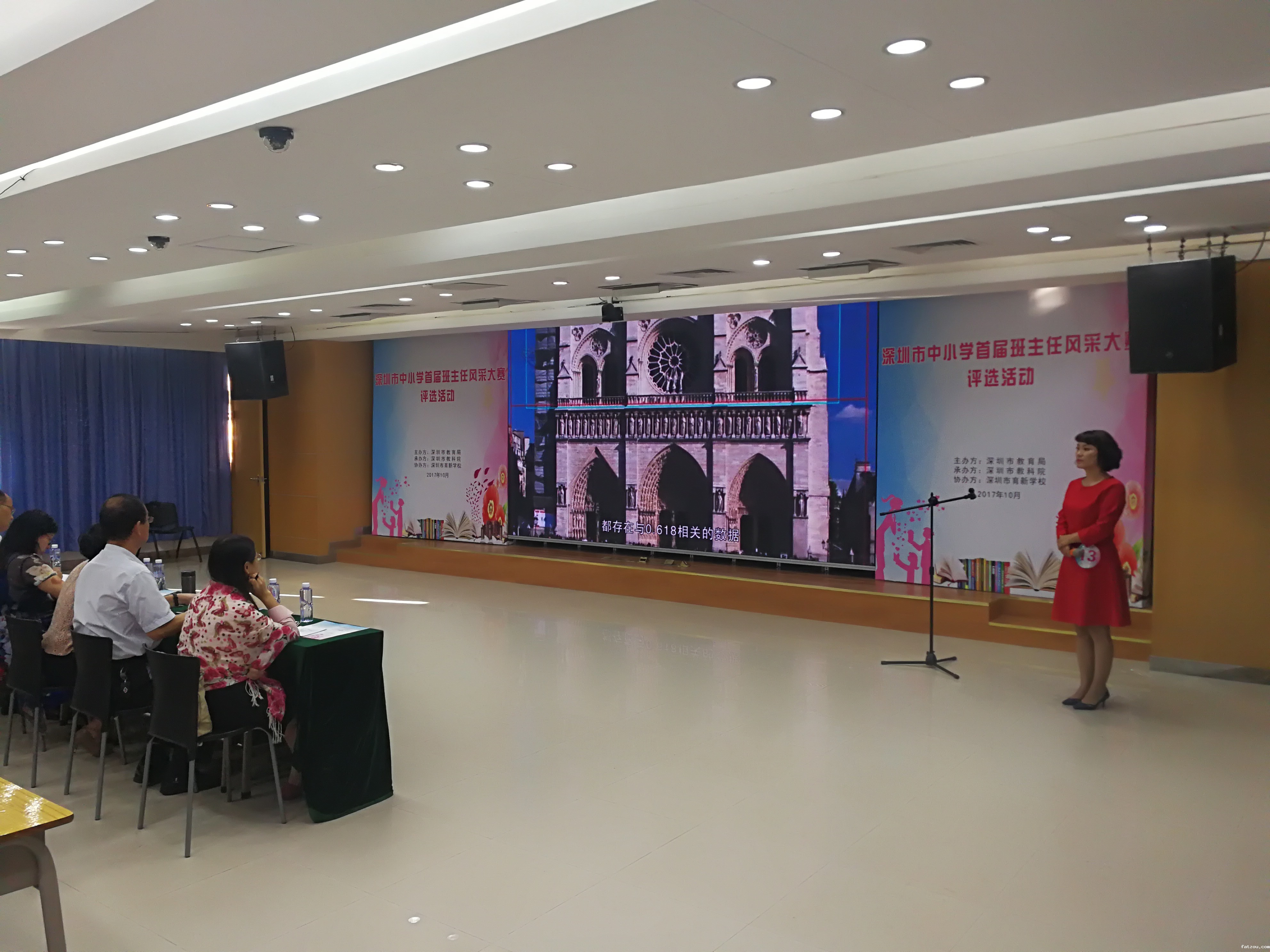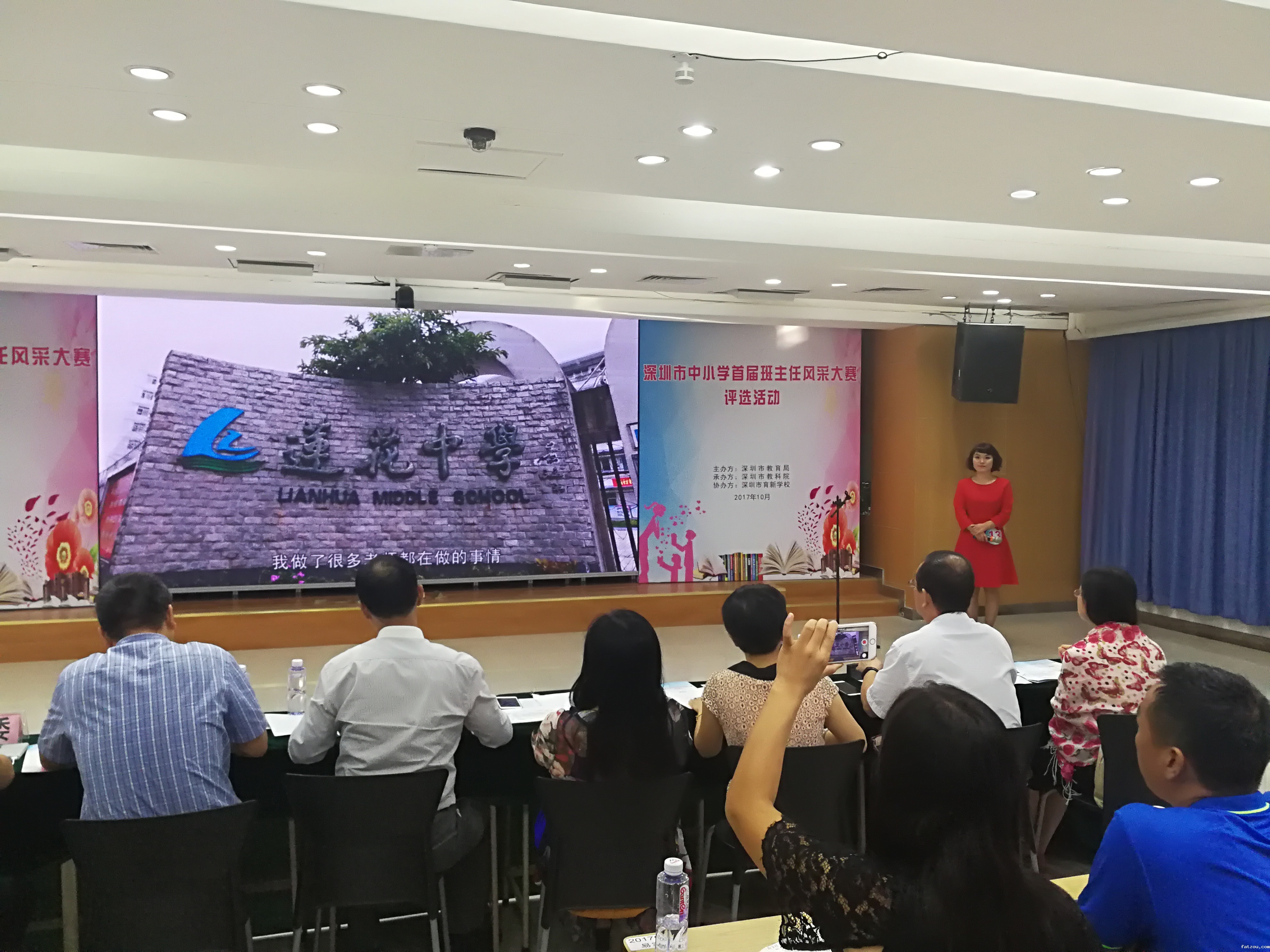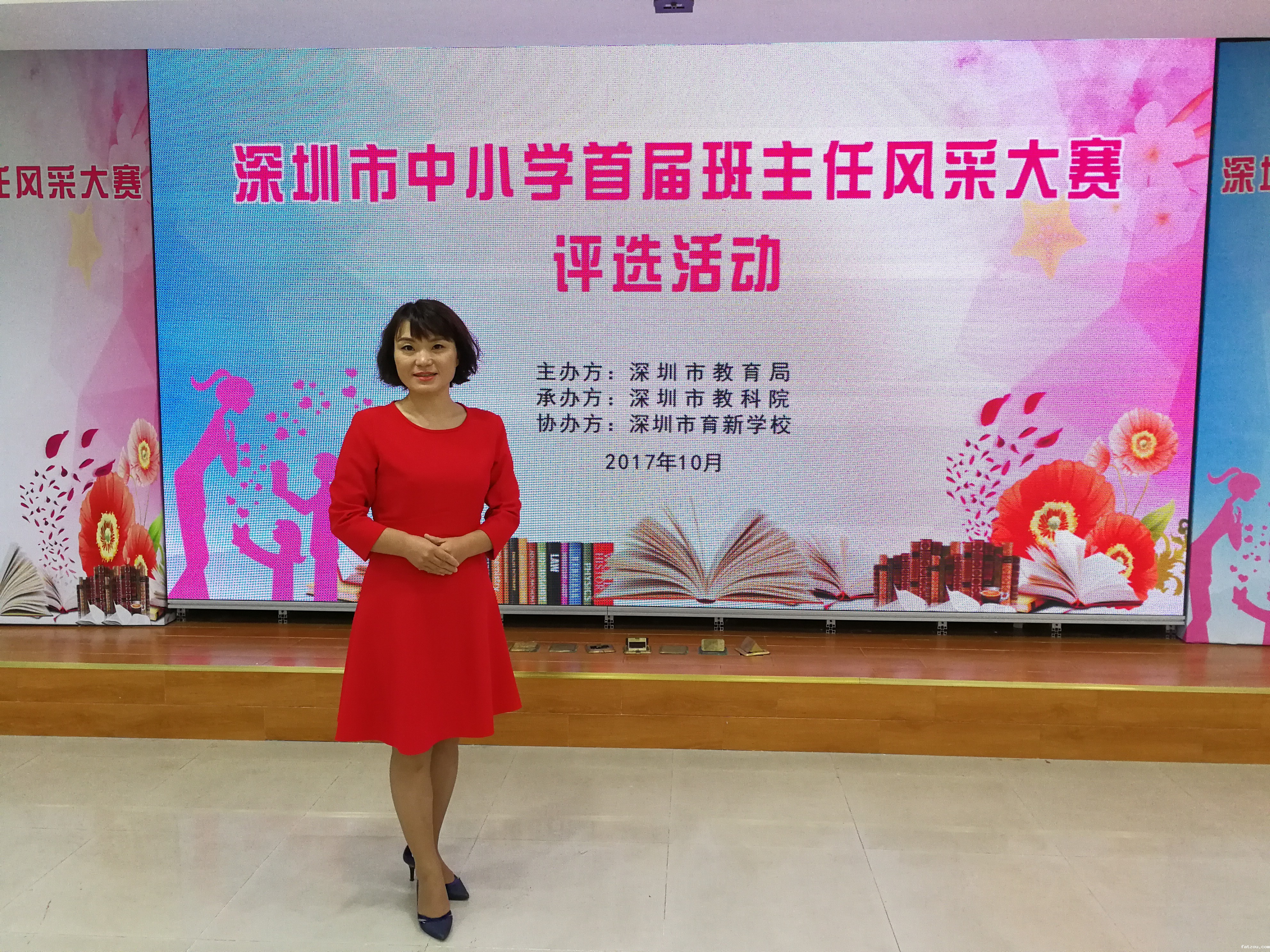 本次大赛赛程经历了暑期动员、9月区级选拔,于2017年10月13、14日在深圳市育新学校举行了总决赛。来自全市各区的优秀班主任齐聚一堂。在经过微视频展示、班队会设计、情景答辩等三个比赛环节的激烈角逐后,我校殷晓微老师以优雅、淡定、多才、语言精炼、思路清晰、反应敏捷受到评委和与会者高度赞誉,取得深圳市首届班主任风采大赛一等奖的好成绩。